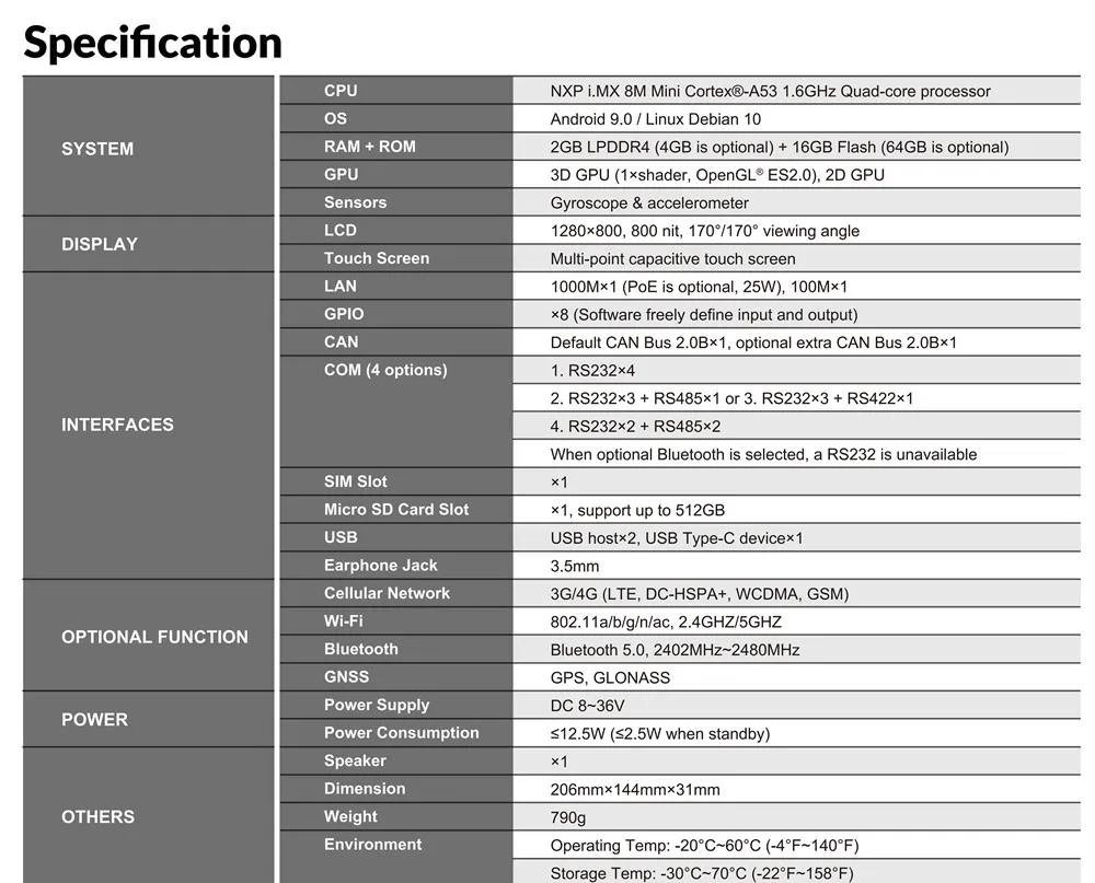 | System | CPU | NXP i.MX 8M Mini Cortex®-A53 1.6GHz Quad-core processor |